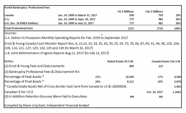 The total Nortel bankruptcy professional fees disclosed as of October 25, 2017 is US$2.2 billion, or 26% of the US$8.2 billion of cash distributed to its creditors. The Nortel CCAA proceeding is still ongoing after almost 9 years to date. 10 Nortel businesses, including the intellectual property patents, were sold between 2009 and 2011. The Nortel global estate had peak assets post bankruptcy filing of US$10.5 billion at 2011. The next 6 years were spent negotiating, mediating and litigating on how the cash should be distributed to the three geographic estates of Canada, US and UK(EMEA).